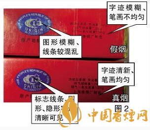 真品“中華”印刷套色準確,字跡清新、筆畫均勻,字樣邊緣呈細微的齒輪狀,而不是人們普遍認為的平滑狀。假煙字跡模糊、筆畫不均勻,字樣邊緣呈平滑狀。真品“中華”原產地標志采用中國地圖圖案,細看海南島和臺灣島為空心,在某些角度和光線下圖案背景會呈現“中華”字樣,標志線條、圖形、隱形字跡清晰可見。假煙原產地標志圖形模糊、線條較混亂。
