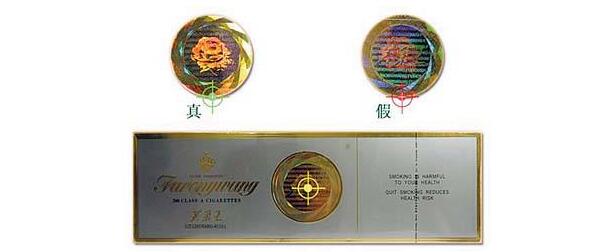 (2)看防偽標記:條盒的正面芙蓉花防偽標記,真煙的印刷在同一側面看到的只有一個圖樣;假煙的印刷在同一側面看到是幾個在一起的圖樣。