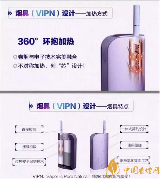看到海報圖片上面介紹說,煙具VIPN為360度環抱加熱,具有直接拔插、連續抽吸、過熱安全保護技術等特點。
