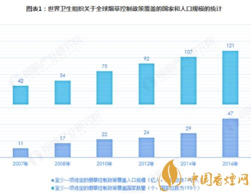 世界衛(wèi)生組織(World Health Organization,簡稱WHO)發(fā)布的主題為監(jiān)測煙草使用與預(yù)防政策《2017年全球煙草流行報告》顯示,當(dāng)前全球控?zé)熣叩母采w面繼續(xù)擴(kuò)大,全球共有121個國家共47億人口(全球近三分之二的人口)受到控?zé)熣叩挠绊懀壳叭杂?4個國家共27億人未受到控?zé)熣叩母采w。此外,雖然部分國家和地區(qū)的卷煙消費量有所下滑,全球卷煙消費的增速放緩,但全球吸煙人口數(shù)量仍在不斷增加。