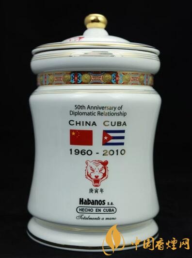 該藏品采用獨特瓷罐包裝,瓷罐上印有中國古巴國旗、中古建交時間、中國虎頭圖騰等,并用中文標注上了“庚寅年”,罐蓋上附有加溫器,并用軟木做密封。內含25支環徑為52、長度為 6.4英寸的雙魚雷型雪茄。全球限量2010罐,此罐編號為532號,由時任古巴駐華大使白詩德(Alberto Jesus Blanco Silva)簽贈。
