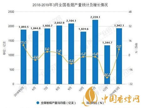 2018年全年全國卷煙累計產量23356.2億支,累計下降0.4%。截止至2019年3月全國卷煙產量為1942.1億支,同比增長6.7%。累計方面,2019年1-3月全國卷煙產量累計達到6911.3億支,同比增長7.8%。