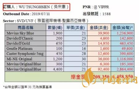 除此之外,黃國昌還貼出一張“訂購單”圖片,其中顯示“訂購”內(nèi)容為八種香煙,金額總計6458850元新臺幣,還標注了航班、日期、機場等信息,而“訂購人”一欄還清楚寫著“吳宗憲”的大名。