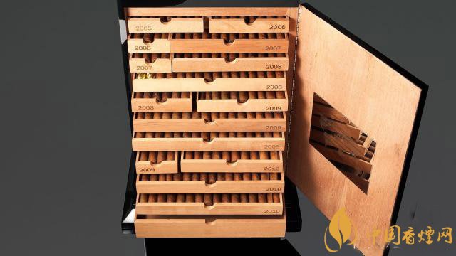 雪茄柜是一個(gè)木制烤漆立柜,方方正正的。主體是黑色,雪茄盒上裝飾著一張世界地圖,雪茄系列所代表的任何國(guó)家/地區(qū)都會(huì)在柜子表面上發(fā)出黑暗的光芒。打開(kāi)柜子,里面是不同年份的抽屜,抽屜里面裝著這個(gè)年份的地區(qū)限量版雪茄。