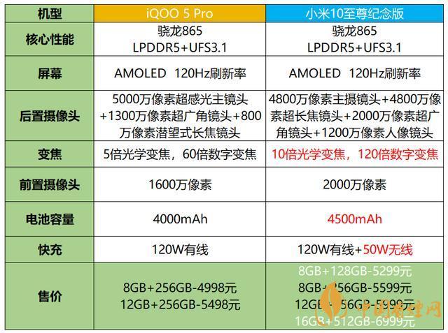 首先放上iQOO5 Pro版和小米10至尊紀念版的配置對比: