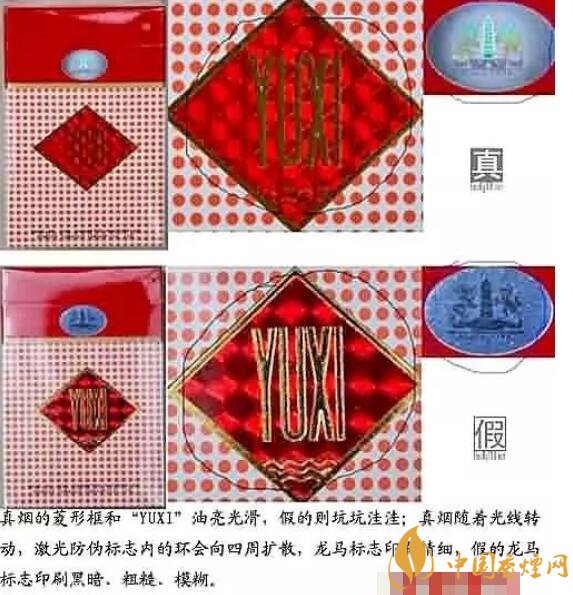 2.外包裝上的“YUXI”標識,真的玉溪煙該標識從不同角度觀察,呈現出不同的圖形,且幾何圖形完整,邊緣規則整齊;反之則為假煙。
