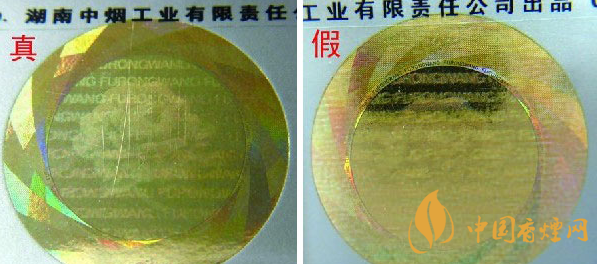 ②迎光觀察激光全息圖案:真品卷煙圖案內(nèi)拼音字母、芙蓉花及“芙蓉王”轉(zhuǎn)換不同角度,都會(huì)呈現(xiàn)不同圖案的切換,且層次清晰、字體完整;假冒卷煙無論如何轉(zhuǎn)換角度,都無法達(dá)到完美切換,字體模糊,圖案缺失嚴(yán)重。