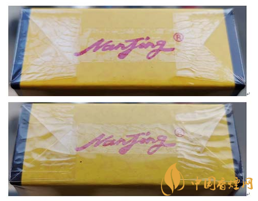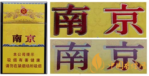 假冒卷煙:該款假冒卷煙南京字體邊緣金色輪廓線和筆畫內無小圓點,字體筆畫顏色暗淡,燙金套印有偏差。圖3上真下假