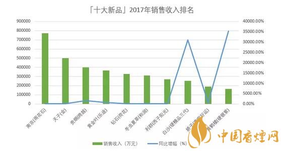以銷售收入評價,「十大新品」2017年合計銷售收入達到354.3億元,同比增加139.3億元,增長64.7%,平均單箱批發均價達到6.2萬元;銷售收入最高的「南京(雨花石)」達到77.4億元,最少的「黃鶴樓(硬銀紫)」只有16.3億元;單箱批發均價最高的「南京(雨花石)」達到13.25萬元,最低的「黃鶴樓(硬銀紫)」只有3.25萬元。