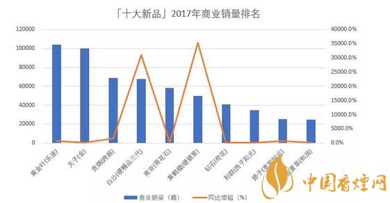 以商業銷量衡量,「十大新品」2017年合計銷量57.4萬箱,同比增加40.1萬箱,增長230.8%;十款產品的平均銷量突破5萬箱,平均增量達到4萬箱;銷量最大的「黃金葉(樂途)」突破10萬箱,最小的「冬蟲夏草(和潤)」也有2.4萬箱;增量最大的「黃金葉(樂途)」超過9萬箱,最少的「利群(西子陽光)」同比增加1.1萬箱。
