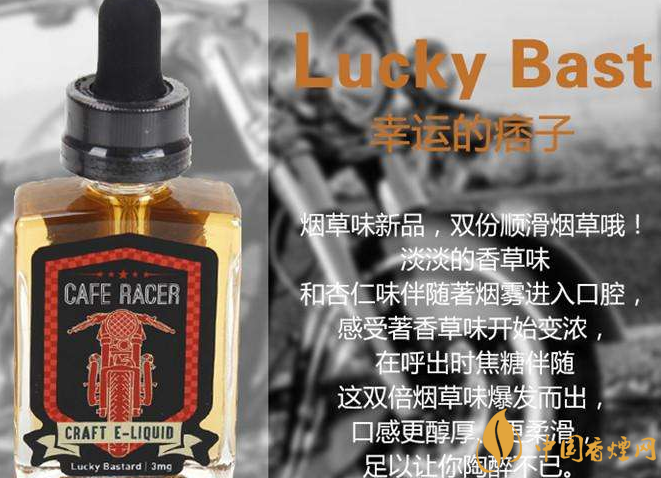 美國金獎煙油有哪些?美國金獎電子煙油Cafe就是其中一款,CAFE RACER摩托車系列煙油為加州恩西尼塔斯的始創者手工制作,均使用方形瓶裝,全系列有3款口味并都貼有印著機車圖案的標簽,為:Lucky13(幸運13)、Pech guzzi(桃子機車,guzzi為意大利語的摩托車)和Yogurt bomb(優格炸彈),3款煙油的PG:VG均為30:70,適用于儲油和滴油霧化器,其中的Lucky13為美國峰會金獎煙油上的煙草口味金獎得主。