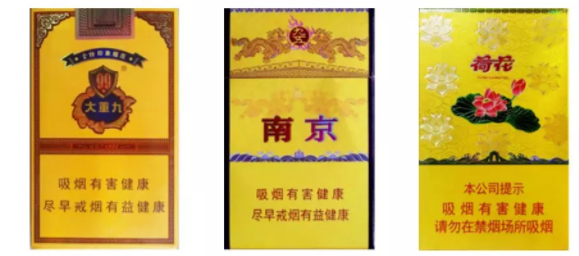 在中國傳統審美中,富貴金色是權貴階層的代表色彩,那么,高端香煙頻繁出現金色包裝就不足為奇了。2018卷煙流行色的從以下幾款就可以看出:例如,云煙(大重九)南京(九五之尊)、鉆石(金一品荷花)等。