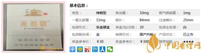 類型 :烤煙型 焦油量 :10mg 煙氣煙堿量 :1mg 一氧化碳量 :11mg
