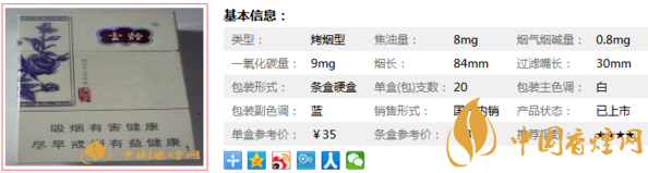 類型 :烤煙型 焦油量 :8mg 煙氣煙堿量 :0.8mg 一氧化碳量 :9mg