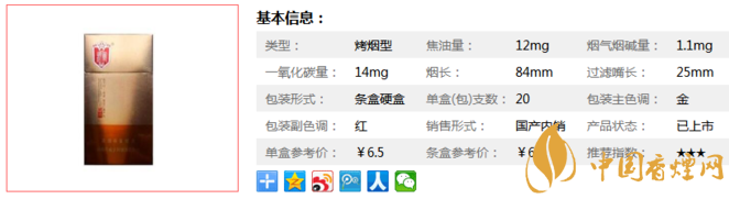 類型 :烤煙型 焦油量 :12mg 煙氣煙堿量 :1.1mg 一氧化碳量 :14mg