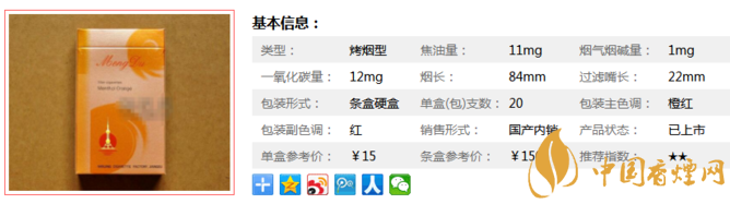 類型 :烤煙型 焦油量 :11mg 煙氣煙堿量 :1mg 一氧化碳量 :12mg