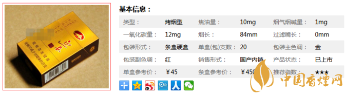類型 :烤煙型 焦油量 :10mg 煙氣煙堿量 :1mg 一氧化碳量 :12mg