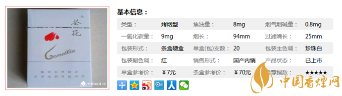 這款茶花煙比常規的煙稍微細一點,煙長94mm,比常見的細枝又粗了一點,相近的香煙還有嬌子X、釣魚臺藍景泰、中南海(5mg細枝)等,這款94mm的確實很耐抽,很實在的感覺。下面我們一起來看茶花94mm的參數信息:焦油量:8mg 煙堿量:0.8mg 一氧化碳量:9mg