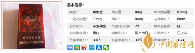 功能降焦:精選津巴布韋、云南等優質原料煙葉,添加靈芝提純營養物質,采用多項前沿降焦技術和柔性加工工藝,汲取天然香料之精華,使該產品具有健康的設計理念。下面我們一起來看林海靈芝印象的參數信息:焦油量:8mg 煙堿量:0.8mg 一氧化碳量:10mg