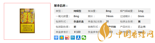 | 類型 :烤煙型 | 焦油量 :8mg | 煙氣煙堿量 :1mg | 一氧化碳量 :8mg |