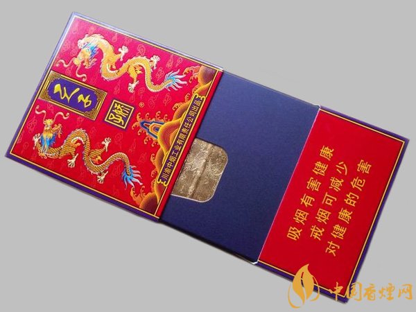 煙盒開啟方式是拉提式的,給人一種高級感,金色內襯紙上也是印著雙龍圖案,內襯板為紫色,這款產品的包裝在配色上是會給人高貴大氣的感覺。