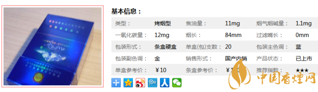 類型 :烤煙型 焦油量 :11mg 煙氣煙堿量 :1.1mg 一氧化碳量 :12mg