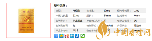 類型 :烤煙型 焦油量 :10mg 煙氣煙堿量 :1mg 一氧化碳量 :11mg