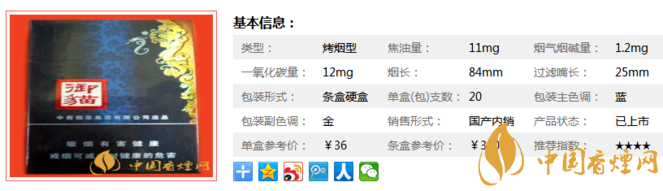 類型 :烤煙型 焦油量 :11mg 煙氣煙堿量 :1.2mg 一氧化碳量 :12mg