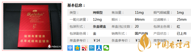 該產品選用醇化而具有獨特香氣的國內外優質原料,輔于天然植物精華香精香料,依托紅塔集團技術中心雄厚的技術力量,運用當前業內先進的生物減害制劑和激光打孔技術,突出“高科技、高香氣、低焦油、低危害”的風格特點。下面我們一起來看白沙尚品紅的參數信息:焦油量:11mg. 煙堿量:1mg. 一氧化碳量:12mg.