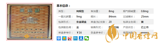 類型 :烤煙型 焦油量 :12mg 煙氣煙堿量 :1.1mg 一氧化碳量 :13mg