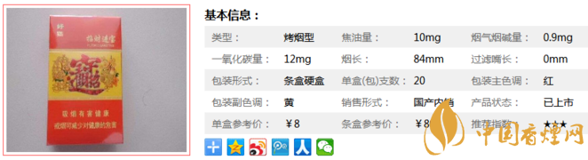 類型 :烤煙型 焦油量 :10mg 煙氣煙堿量 :1mg 一氧化碳量 :13mg