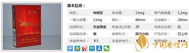 紅梅硬虹香煙,這款煙在煙民中的評價中比較好,是一款經典老煙,抽過的人普遍對這款煙留下了深刻的印象。這款煙現如今已經非常難買到了,20元以內的香煙恐怕沒幾個能超越它。口感好,性價比高,值得推薦。經香煙網小編市場調查紅梅硬虹售價為5元/包。