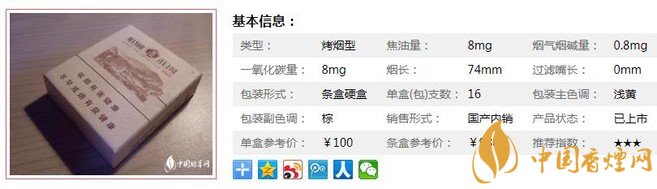 類型 :烤煙型 焦油量 :8mg 煙氣煙堿量 :0.8mg 一氧化碳量 :8mg