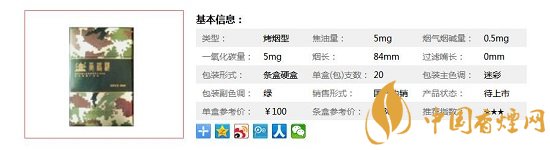 類型 :烤煙型 焦油量 :5mg 煙氣煙堿量 :0.5mg 一氧化碳量 :5mg