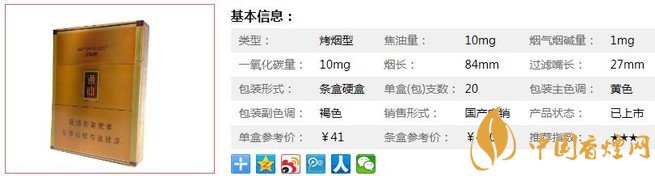 類型 :烤煙型 焦油量 :10mg 煙氣煙堿量 :1mg 一氧化碳量 :10mg