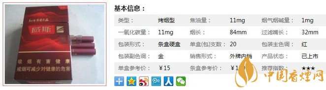 新款式的威斯包裝還是比較好看的,味道從以前的混合型改為現在的烤煙型,煙氣飽滿濃郁,但是沒什么香氣。但還是對的起這個價格的,口感還行,但是屬于小眾化香煙。經香煙網小編市場調查威斯經典售價為15元/包。