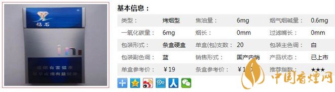這款煙焦油含量低、香氣濃郁、醇厚,實屬好煙,可作為口糧,目前河北省產煙性價比最高的一個,口味在鉆石煙里面算是上等了,包裝也很炫,綜合起來非常不錯,值得擁有。經香煙網小編市場調查鉆石扁藍時尚售價為19元/包。