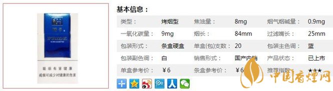 類型 :烤煙型 焦油量 :8mg 煙氣煙堿量 :0.9mg 一氧化碳量 :9mg