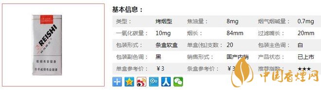 類型 :烤煙型 焦油量 :8mg 煙氣煙堿量 :0.7mg 一氧化碳量 :10mg