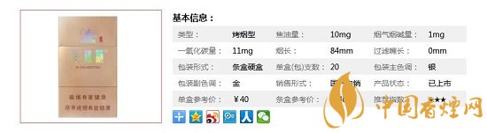 類型 :烤煙型 焦油量 :11mg 煙氣煙堿量 :1.2mg 一氧化碳量 :11mg