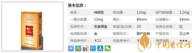 類型 :烤煙型 焦油量 :12mg 煙氣煙堿量 :1.2mg 一氧化碳量 :13mg