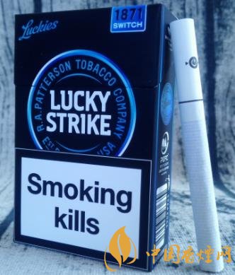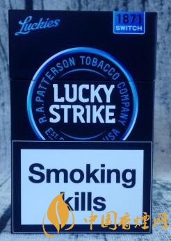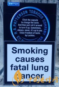 藍色,本就屬于神秘的色調。二者結合起來,帶來的視覺感,無疑更加強烈。撫摸煙盒的六面體,觀賞著黑藍相融的色調,不失為一種雅趣。圓圈中的LUCKY STRIKE,撫摸起來凹凸感很明顯。翻蓋處1871下方的SWITCH,意為“轉變、轉換”,也就是指因為過濾嘴內置爆珠,從而改變煙的味道。這款歐盟版的煙盒正面上方,沒有印制CLICK(捏破)字樣及爆珠標識,煙盒底部和內襯錫紙上則有印制。