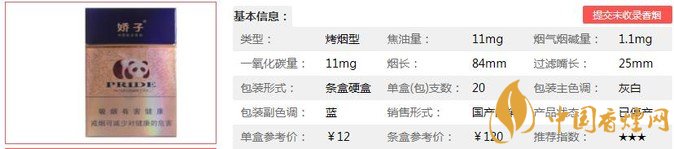類型 :烤煙型 焦油量 :11mg 煙氣煙堿量 :1.1mg 一氧化碳量 :11mg