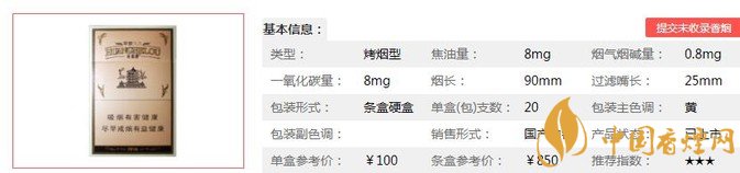 類型 :烤煙型 焦油量 :8mg 煙氣煙堿量 :0.8mg 一氧化碳量 :8mg