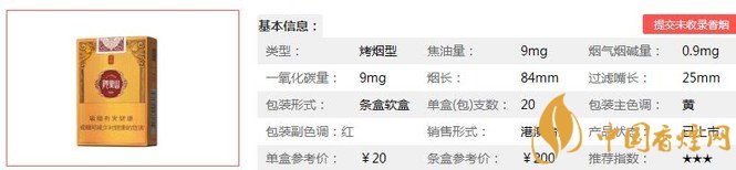 類型 :烤煙型 焦油量 :9mg 煙氣煙堿量 :0.9mg 一氧化碳量 :9mg