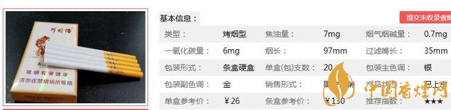 | 類型 :烤煙型 | 焦油量 :7mg | 煙氣煙堿量 :0.7mg | 一氧化碳量 :6mg |