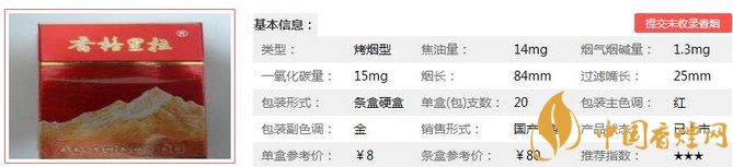 | 類型 :烤煙型 | 焦油量 :14mg | 煙氣煙堿量 :1.3mg | 一氧化碳量 :12mg |