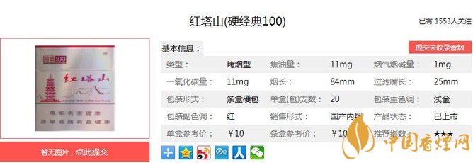 三、紅塔山硬經典100香煙參數