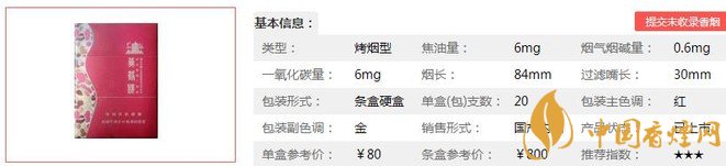 類型 :烤煙型 焦油量 :6mg 煙氣煙堿量 :0.6mg 一氧化碳量 :6mg