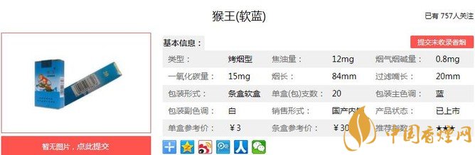 以上便是由香煙網小編為大家介紹的關于猴王軟藍價格及參數 陜西低價煙中的佼佼者的相關信息,想要了解更多有關內容請點擊:猴王喜慶價格及參數 猴王喜慶獨家口感分析